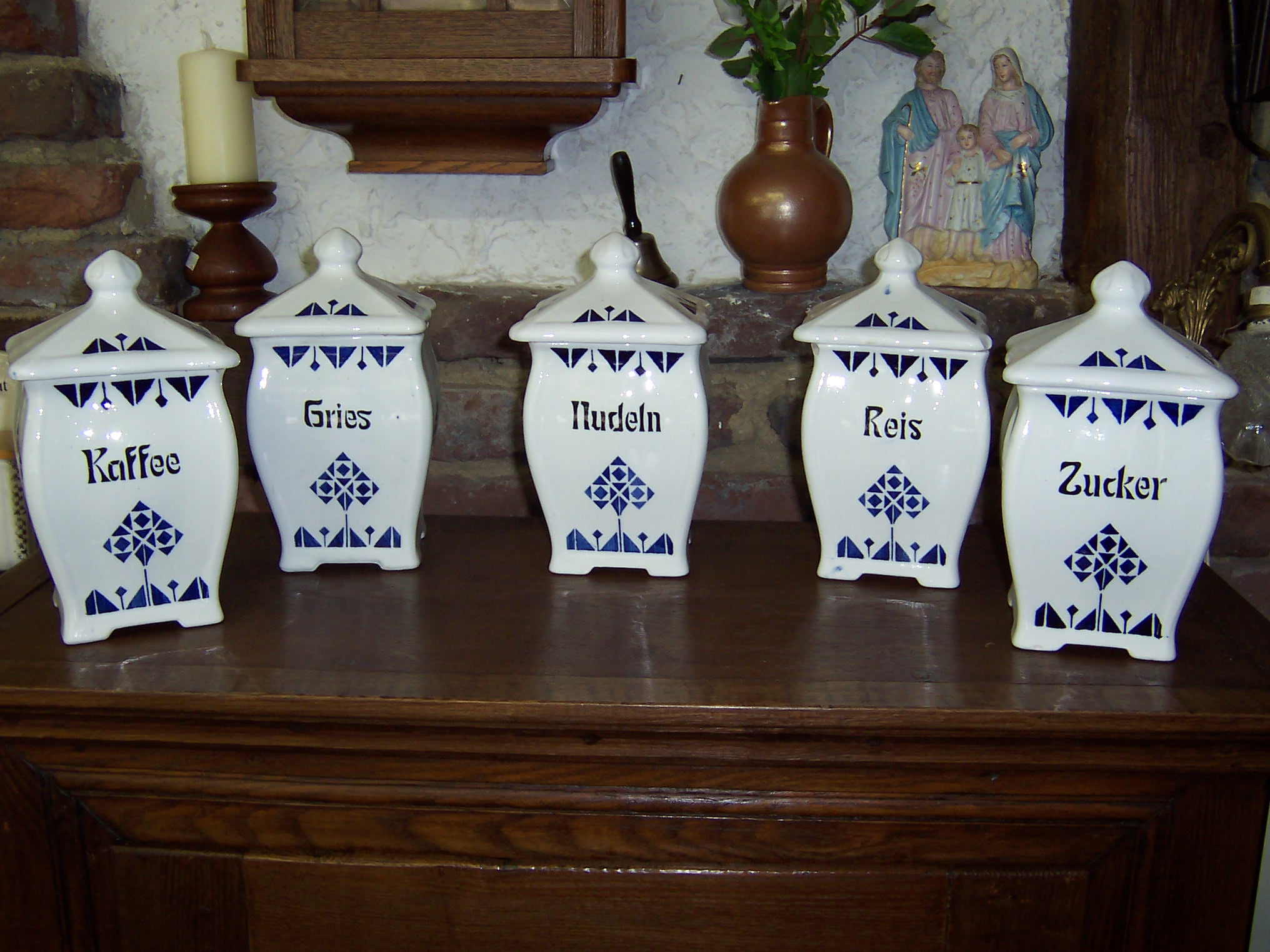 5 Aardewerk (voorraadpotten) met duitse opschrift.